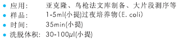 小提試劑盒適合于從1-5ml細(xì)菌培養(yǎng)液中純化大分子量的質(zhì)粒載體,或各種BAC,PAC,粘粒,Cosmid等載體。細(xì)菌收集后,加入Buffer T1/T2裂解,再加入Buffer T3離心沉淀去除蛋白質(zhì)和染色體DNA,在得到的上清液中加入獨(dú)特的結(jié)合液并轉(zhuǎn)移至結(jié)合柱進(jìn)一步去除蛋白質(zhì),經(jīng)過簡(jiǎn)單的兩次洗滌即可得到高純度的BAC/PAC/P1等大片段質(zhì)粒DNA。