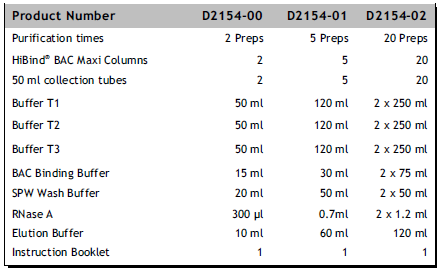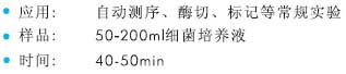 大提試劑盒適合于從50-250ml細菌培養(yǎng)液中純化大分子量的質(zhì)粒載體,或各種BAC,PAC,粘粒,Cosmid等載體。 純化的質(zhì)粒可直接用于大片段測序,酶切,PCR,文庫制備等應用。細菌收集后,加入Buffer T1/T2裂解,再加入Buffer T3離心沉淀去除蛋白質(zhì)和染色體DNA,在得到的上清液中加入獨特的結合液并轉(zhuǎn)移至結合柱進一步去除蛋白質(zhì),經(jīng)過簡單的兩次洗滌即可得到高純度的BAC/PAC/P1等大片段質(zhì)粒DNA。