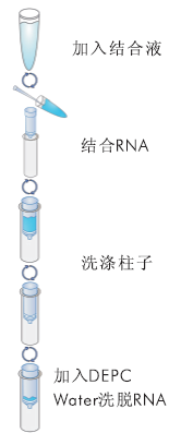 首先加入結(jié)合液至RNA溶液中調(diào)節(jié)結(jié)合條件后,并轉(zhuǎn)移至RNA結(jié)合柱子中離心吸附RNA后,經(jīng)過兩次快速洗滌去除雜質(zhì)和鹽分,最后用DEPC水洗脫出高純度的RNA。由于采用了超薄的RNA結(jié)合柱,最后可用低至10µl的DEPC水洗脫RNA,因而純化的RNA可達(dá)至比較高的濃度,起到濃縮RNA的目的。